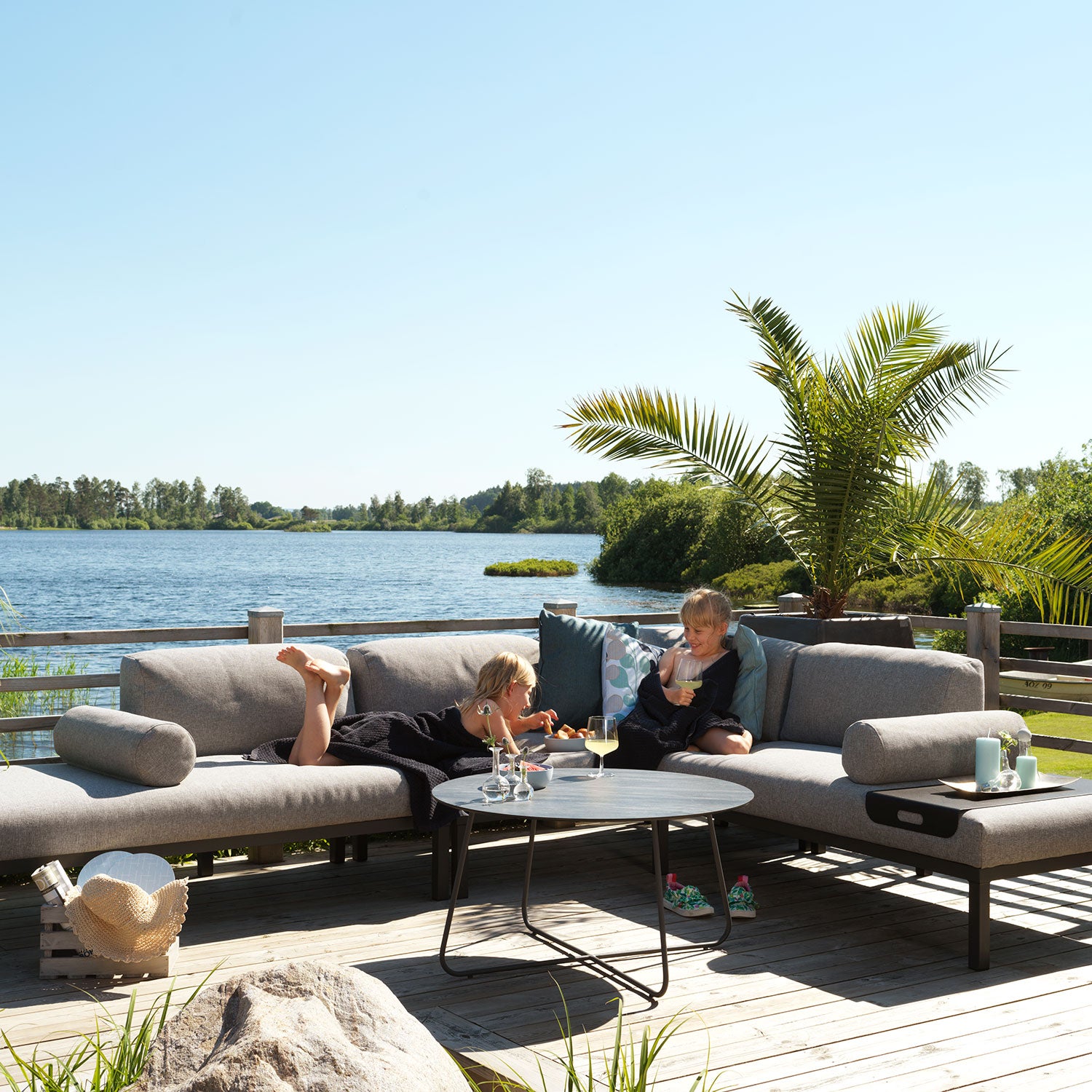Loungegruppen är i första hand tänkt som en traditionell hörnsoffa, men går utmärkt att göra om eller helt använda som en deluxe solsäng för två. Detta gör man genom att vika avsluten inåt, vilket bildar en kvadratisk form. Det gör även utmärkt att använda de två pölkuddarna som kommer till loungegruppen som smarta och bekväma huvudkuddar när gruppen används som solsäng.