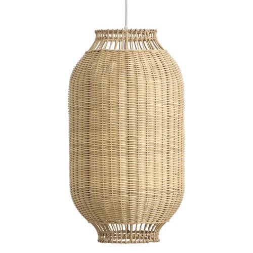 Kou lampskärm är designad av Jin Kuramoto och tillverkas för hand i indonesisk rotting. Den har en inre stomme av järn som ger den en stabil tyngd och säkerställer att den hänger snyggt och stadigt.